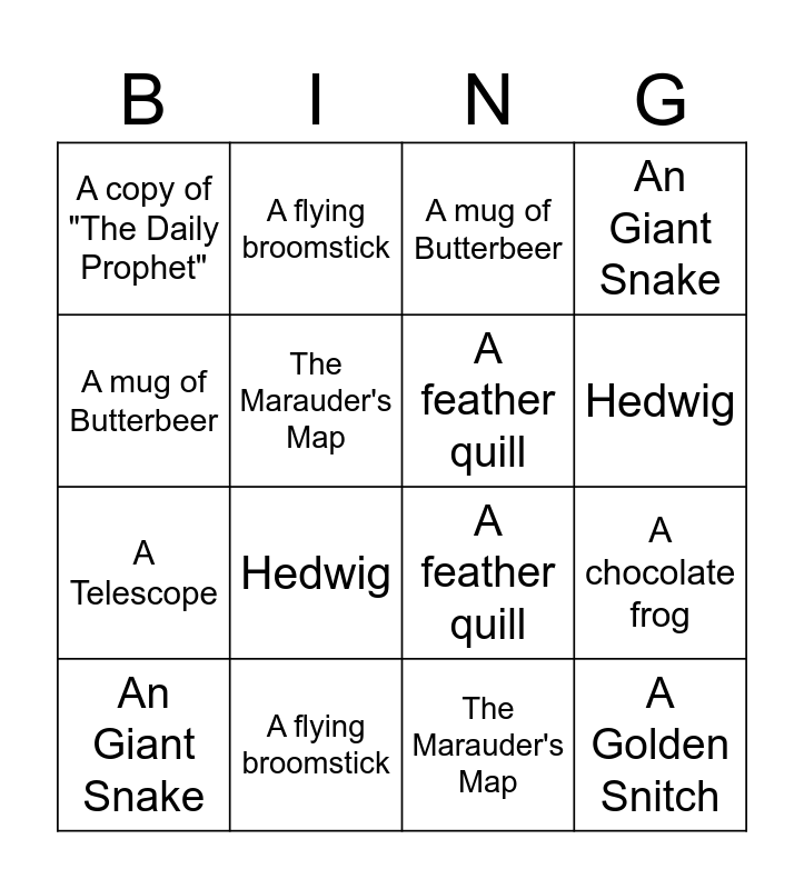 ⚠ This card has duplicate items: A wand (2), A chocolate frog (2), A Golden Snitch (2), A copy of "The Daily Prophet" (2), A mug of Butterbeer (2), A feather quill (2), A wizarding robe (2), A flying broomstick (2), A Telescope (2), The Marauder's Map (2), An Giant Snake (2), A Dark Mark (2), Kreacher (2), Hedwig (2)