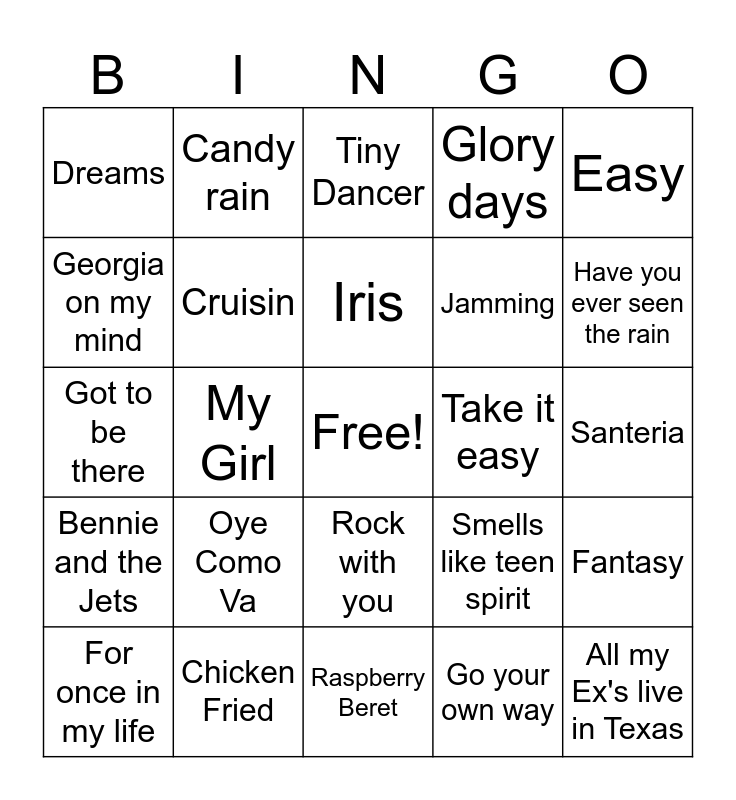 This bingo card has a free space and 29 words: For once in my life, I wanna be where you are, My Girl, Smooth Operator, Dreams, Tiny Dancer, Cruisin, Oye Como Va, Take it easy, Chicken Fried, Santeria, All my Ex's live in Texas, Raspberry Beret, Go your own way, Have you ever seen the rain, Happy feelings, Rock with you, Bennie and the Jets, Easy, Got to be there, Smells like teen spirit, Calm down, Jamming, Georgia on my mind, Glory days, Candy rain, Fantasy, Iris and Every breath you take.