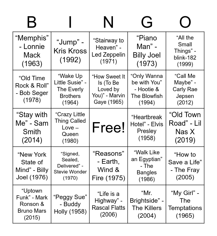 This bingo card has a free space and 100 words: “Hello” - Adele (2015), “I Get Around” - The Beach Boys (1964), “Old Town Road” - Lil Nas X (2019), “California Dreamin’” - The Mamas & The Papas (1965), “TiK ToK” - Kesha (2010), “Sweet Child O’ Mine” - Guns N’ Roses (1987), “Wrecking Ball” - Miley Cyrus (2013), “I Can See Clearly Now” - Johnny Nash (1996), “Blue Velvet” - Bobby Vinton (1962), “Autumn Leaves” - Roger Williams (1966), “Insane in the Brain” - Cypress Hill (1993), “Breathe” - Faith Hill (1999), “Money for Nothing” - Dire Straits (1985), “Peggy Sue” - Buddy Holly (1958), “Just Can’t Get Enough” - Depeche Mode (1985), “Mr. Blue” - The Fleetwoods (1993), “Only Wanna be with You” - Hootie & The Blowfish (1994), “Waterfalls” - TLC (1994), “Blue Suede Shoes” - Carl Perkins (1957), “Dancing in the Street” - Martha Reeves & The Vandellas (1965), “Perfect” - Ed Sheeran (2017), “Blame it on the Boogie” - The Jacksons (1978), “Sunshine of your Love” - Cream (1967), “Rude” - MAGIC! (2014), “Grenade” - Bruno Mars (2010), “Heartbreak Hotel” - Elvis Presley (1958), “All the Small Things” - blink-182 (1999), “Walk Like an Egyptian” - The Bangles (1986), “Everybody” - Tommy Roe (1963), “You Spin Me Round (Like a Record) - Dead or Alive (1983), “Crazy Little Thing Called Love – Queen (1980), “Memphis” - Lonnie Mack (1963), “Hungry Like the Wolf” - Duran Duran (1982), “Hotel California” - Eagles (1976), “Mr. Brightside” - The Killers (2004), “How Sweet It Is (To Be Loved by You)” - Marvin Gaye (1965), “How to Save a Life” - The Fray (2005), “Take Me to Church” - Hozier (2014), “Pour Some Sugar on Me” - Def Leppard (1987), “Jungle Love” - The Time (1984), “It’s My Party” - Lesley Gore (1963), “Respect” - Aretha Franklin (1967), “Stay with Me” - Sam Smith (2014), “No Air” - Jordin Sparks (2007), “Call Me Maybe” - Carly Rae Jepsen (2012), “Stairway to Heaven” - Led Zeppelin (1971), “My Heart Will Go On” - Celine Dion (1997), “Love Song” - Sara Barellies (2007), “Hey Jude” - The Beatles (1968), “Life is a Highway” - Rascal Flatts (2006), “I Want It That Way” - Backstreet Boys (1999), “I’ll Be” - Edwin McCain (1997), “Need You Now” - Lady A (2010), “Radioactive” - Imagine Dragons (2012), “Tainted Love” - Soft Cell (1981), “Payphone” - Maroon 5 (2012), “Creep” - Radiohead (1993), “Yellow” - Coldplay (2000), “Love Letter in the Sand” - Pat Boone (1964), “Piano Man” - Billy Joel (1973), “U Can’t Touch This” - MC Hammer (1990), “Poison” - Bell Biv DeVoe (1990), “Diana” - Paul Anka (1957), “Just Walking in the Rain” - Johnnie Ray (1952), “Livin’ la Vida Loca” - Ricky Martin (1999), “(We’re Gonna) Rock Around the Clock” - Bill Haley & His Comets (1954), “All Summer Long” - Kid Rock (2007), “The Safety Dance” - Men Without Hats (1982), “Hey, Soul Sister” - Train (2010), “School’s Out” - Alice Cooper (1972), “Time After Time” - Cyndi Lauper (1983), “Signed, Sealed, Delivered” - Stevie Wonder (1970), “Achey Breaky Heart” - Billy Ray Cyrus (1992), “Fallin’” - Alicia Keys (2001), “Hey Ya!” - Outkast (2003), “Wannabe” - Spice Girls (1996), “Stuck in the Middle with You” - Stealers Wheel (1972), “Old Time Rock & Roll” - Bob Seger (1978), “Surf City” - Jan & Dean (1963), “Every Breath You Take” - The Police (1983), “California Girls” - Katy Perry (2010), “My Girl” - The Temptations (1965), “Suga Suga” - Baby Bash (2003), “Reasons” - Earth, Wind & Fire (1975), “Billie Jean” - Michael Jackson (1982), “Jump” - Kris Kross (1992), “Sweet Emotion” - Aerosmith (1975), “Can’t Stop The Feeling!” - Justin Timberlake (2016), “All I Wanna Do” - Sheryl Crow (1993), “New York State of Mind” - Billy Joel (1976), “With or Without You” - U2 (1987), “Paranoid” - Black Sabbath (1970), “Under the Boardwalk” - The Drifters (1964), “Uptown Funk” - Mark Ronson & Bruno Mars (2015), “Wake Up Little Susie” - The Everly Brothers (1964), “I Want Candy” - Bow Wow Wow (1980), “I’m Yours” - Jason Mraz (2008), “What’s Going On” - Marvin Gaye (1971), “I Wanna Dance with Somebody” - Whitney Houston (1987) and “I Can See For Miles” - The Who (1967).