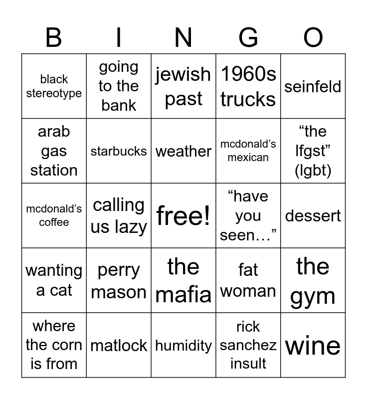 This bingo card has a free space and 24 words: perry mason, matlock, weather, where the corn is from, seinfeld, black stereotype, arab gas station, going to the bank, “have you seen…”, the mafia, mcdonald’s mexican, mcdonald’s coffee, fat woman, the gym, starbucks, rick sanchez insult, dessert, jewish past, “the lfgst” (lgbt), calling us lazy, wine, wanting a cat, 1960s trucks and humidity.