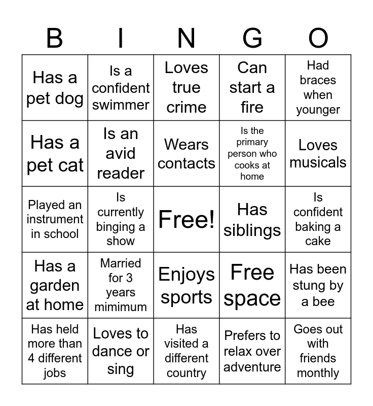 This bingo card has a free space and 25 words: Married for 3 years mimimum, Has visited a different country, Wears contacts, Has held more than 4 different jobs, Had braces when younger, Has a pet dog, Has a pet cat, Is a confident swimmer, Has siblings, Enjoys sports, Is the primary person who cooks at home, Played an instrument in school, Free space, Has been stung by a bee, Is an avid reader, Prefers meat and potatoes, Is confident baking a cake, Loves true crime, Loves musicals, Is currently binging a show, Goes out with friends monthly, Loves to dance or sing, Has a garden at home, Can start a fire and Prefers to relax over adventure.