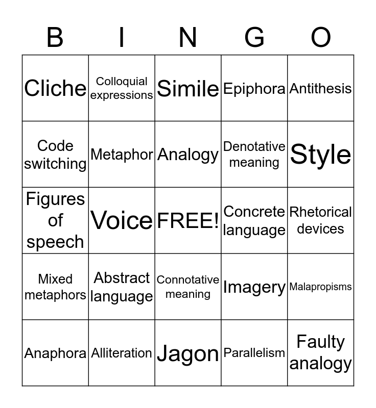 This bingo card has a free space and 24 words: Abstract language, Alliteration, Analogy, Anaphora, Antithesis, Cliche, Code switching, Colloquial expressions, Concrete language, Connotative meaning, Denotative meaning, Figures of speech, Imagery, Malapropisms, Metaphor, Parallelism, Rhetorical devices, Simile, Style, Voice, Faulty analogy, Mixed metaphors, Epiphora and Jagon.