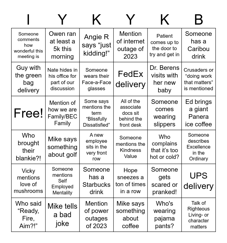 This bingo card has 36 words: Hope sneezes a ton of times in a row, Someone has a Starbucks drink, Mike says something about coffee, Guy with the green bag delivery, Who brought their blankie?!, All of the associate docs sit behind the front desk, Nate hides in his office for part of our discussion, Mention of power outages of 2023, Patient comes up to the door to try and get in, Someone gets scared or pranked!, Crusaders or “doing work that matters” is mentioned, Mention of internet outage of 2023, UPS delivery, Mention of how we are Family/BEC Family, FedEx delivery, Someone comments how wonderful this meeting is, Vicky mentions love of mushrooms, Someone comes wearing slippers, Free!, Angie R says “just kidding!”, Some says mentions the term “Blissfully Dissatisfied”, Mike says something about golf, Someone mentions the Kindness Value, A new employee sits in the very front row, Who complains that it’s too hot or cold?, Owen ran at least a 5k this morning, Dr. Berens visits with her new baby, Mike tells a bad joke, Someone wears their Face-a-Face glasses, Someone has a Caribou drink, Talk of Righteous Living- or character matters, Who said “Ready, Fire, Aim?!”, Someone describes Excellence in the Ordinary, Ed brings a giant Panera ice coffee, Someone mentions Self Employed Mentality and Who's wearing pajama pants?.