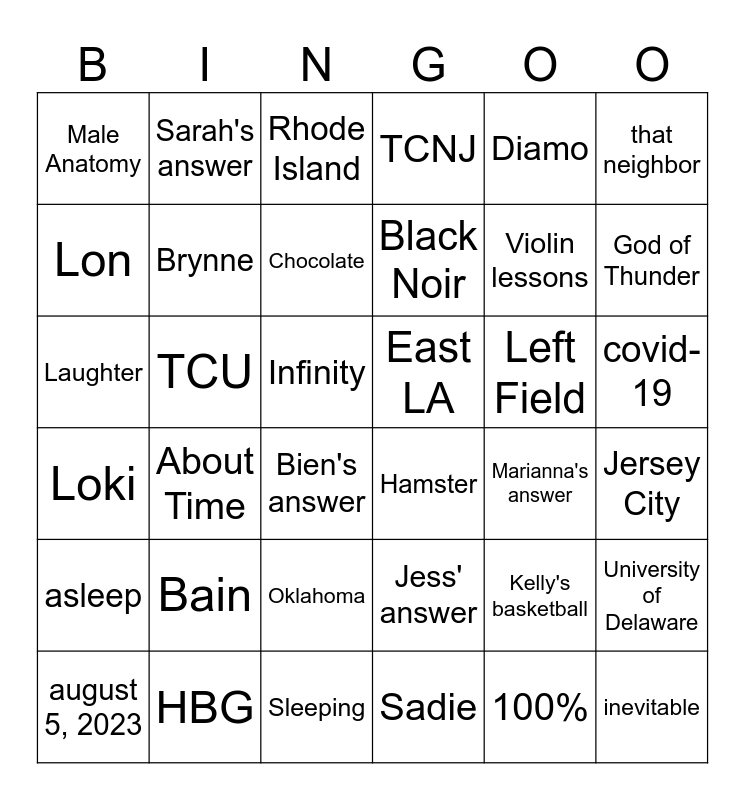 This bingo card has 36 words: Jess' answer, Oklahoma, Sadie, Lon, Loki, East LA, Brynne, Sleeping, Diamo, Kelly's basketball, God of Thunder, TCNJ, University of Delaware, TCU, Black Noir, Male Anatomy, asleep, Left Field, Laughter, Rhode Island, Infinity, About Time, Hamster, Bien's answer, Marianna's answer, Sarah's answer, Violin lessons, HBG, Chocolate, that neighbor, inevitable, august 5, 2023, Jersey City, covid-19, Bain and 100%.