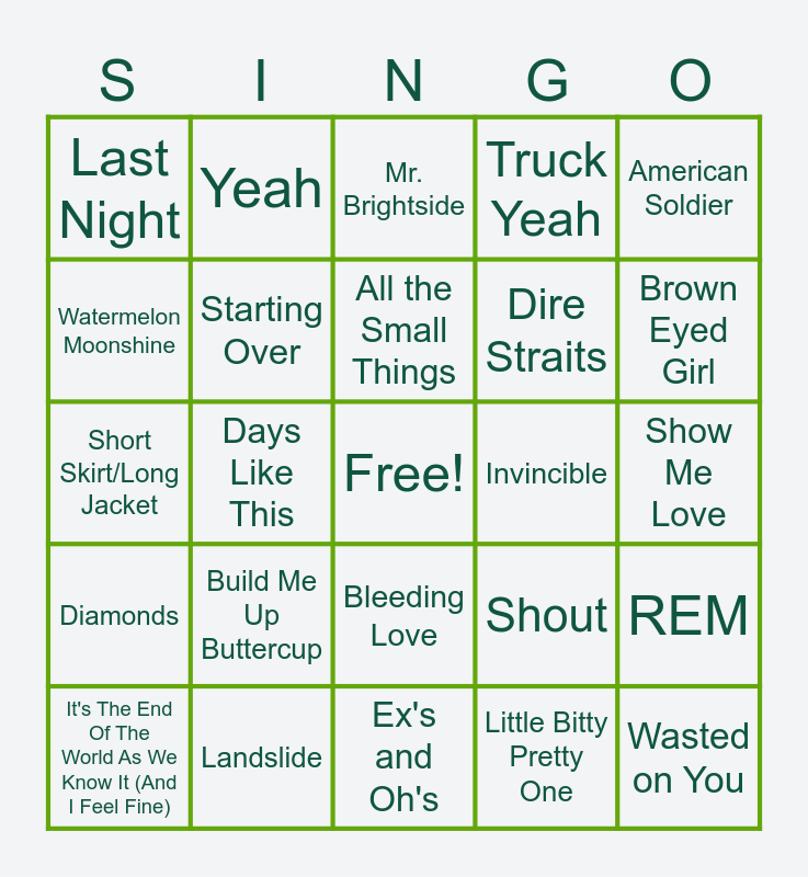 This bingo card has a free space and 59 words: Someone, Landslide, More than a Feeling, Diamonds, Little Bitty Pretty One, Just Dance, Starting Over, Romeo & Juliet, Dire Straits, Bury me in Georgia, Truck Yeah, Walk the Line, Watermelon Moonshine, Til You Can't, Tennessee Whisky, Last Night, Wasted on You, American Soldier, Ice Ice Baby, All the Small Things, Invincible, Mr. Brightside, It's The End Of The World As We Know It (And I Feel Fine), REM, Mint Mony!, Sweet Caroline, Fast Car, Lavender Haze, Brown Eyed Girl, Zombie, Midnight Hour, One Day, Another Song About the Weekend, Heartfirst, Yeah, Candles in the Wind, Monday Morning, Days Like This, Cold Heart, Short Skirt/Long Jacket, God bless the USA, Build Me Up Buttercup, Show Me Love, Dancing Queen, Since U Been Gone, American Boy, Iris, Fallin, Bleeding Love, Ex's and Oh's, In the Mood, Livin' on a Prayer, Fly Me to the Moon, Queen of Me, I Think I Love You, Shout, Watermelon Sugar, Sound of Silence and Take me to Church.