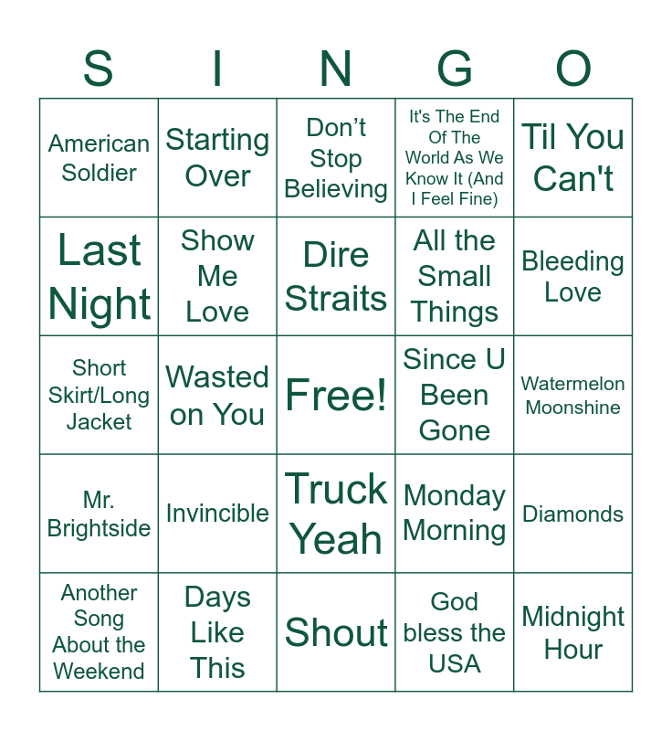 This bingo card has a free space and 65 words: Someone, Landslide, More than a Feeling, Diamonds, Little Bitty Pretty One, Just Dance, Starting Over, Romeo & Juliet, Dire Straits, Bury me in Georgia, Truck Yeah, Walk the Line, Watermelon Moonshine, Til You Can't, Tennessee Whisky, Last Night, Wasted on You, American Soldier, Ice Ice Baby, All the Small Things, Invincible, Mr. Brightside, It's The End Of The World As We Know It (And I Feel Fine), Sweet Caroline, Fast Car, Lavender Haze, Brown Eyed Girl, Zombie, Midnight Hour, One Day, Another Song About the Weekend, Heartfirst, Yeah, Candles in the Wind, Monday Morning, Days Like This, Cold Heart, Short Skirt/Long Jacket, God bless the USA, Build Me Up Buttercup, Show Me Love, Dancing Queen, Since U Been Gone, American Boy, Iris, Fallin, Bleeding Love, Ex's and Oh's, In the Mood, Livin' on a Prayer, Fly Me to the Moon, Queen of Me, I Think I Love You, Shout, Watermelon Sugar, Sound of Silence, Take me to Church, Don’t Stop Believing, Ring of Fire, Back in Black, Home Sweet Home, Cecilia, Africa, Happier and Drops of Jupiter.