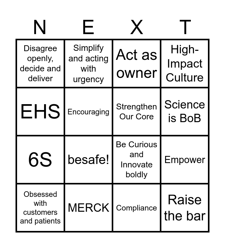 This bingo card has 18 words: besafe!, Raise the bar, Act as owner, Disagree openly, decide and deliver, Be Curious and Innovate boldly, High-Impact Culture, Obsessed with customers and patients, Simplify and acting with urgency, Science is BoB, 6S, Compliance, EHS, Empower, Encouraging, Strengthen Our Core, Shaping, MERCK and Progressing.