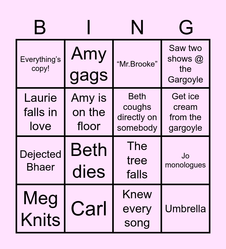 This bingo card has 20 words: Jo monologues, Marmee swoops in, “Mr.Brooke”, Amy draws, Meg Knits, Laurie falls in love, Carl, Everything’s copy!, Dejected Bhaer, Amy gags, Beth dies, The tree falls, Amy is on the floor, Umbrella, Beth coughs directly on somebody, “WHAT”, Get ice cream from the gargoyle, Saw two shows @ the Gargoyle, Knew every song and Knows Bhaer’s dance.