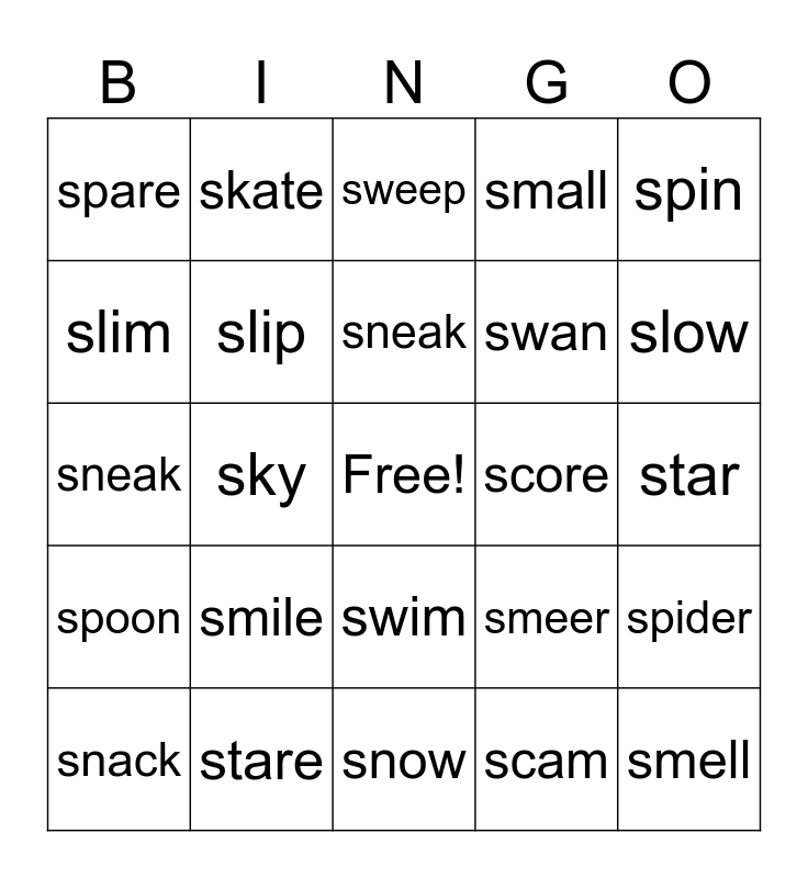 This bingo card has a free space and 24 words: smile, stare, sneak, snack, spin, spare, slim, skate, score, swim, swan, sneak, smeer, spider, slip, scam, star, sweep, slow, sky, smell, spoon, small and snow.