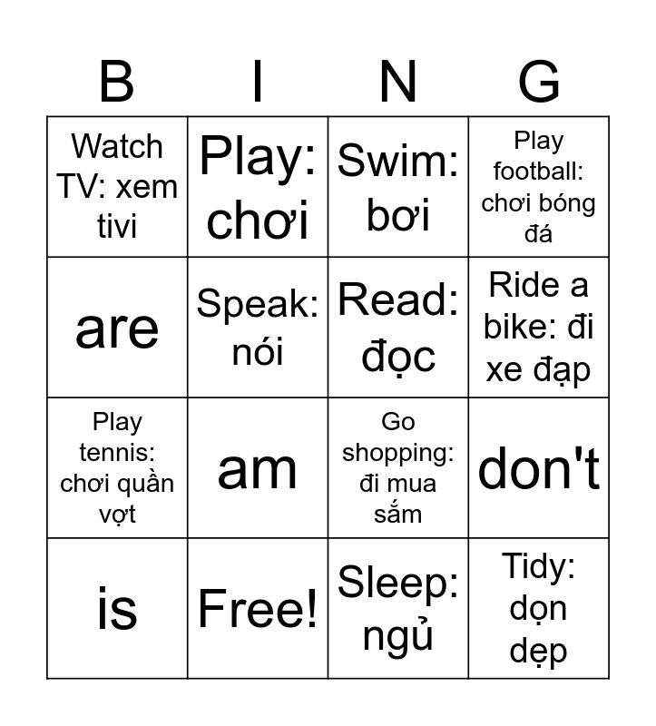 This bingo card has 21 words: Free!, Do: làm, Play: chơi, Eat: ăn, Sleep: ngủ, Read: đọc, Watch TV: xem tivi, Swim: bơi, Go shopping: đi mua sắm, Ride a bike: đi xe đạp, Play tennis: chơi quần vợt, Play football: chơi bóng đá, Tidy: dọn dẹp, Write: viết, Speak: nói, Drink: uống, is, am, are, don't and doesn't.