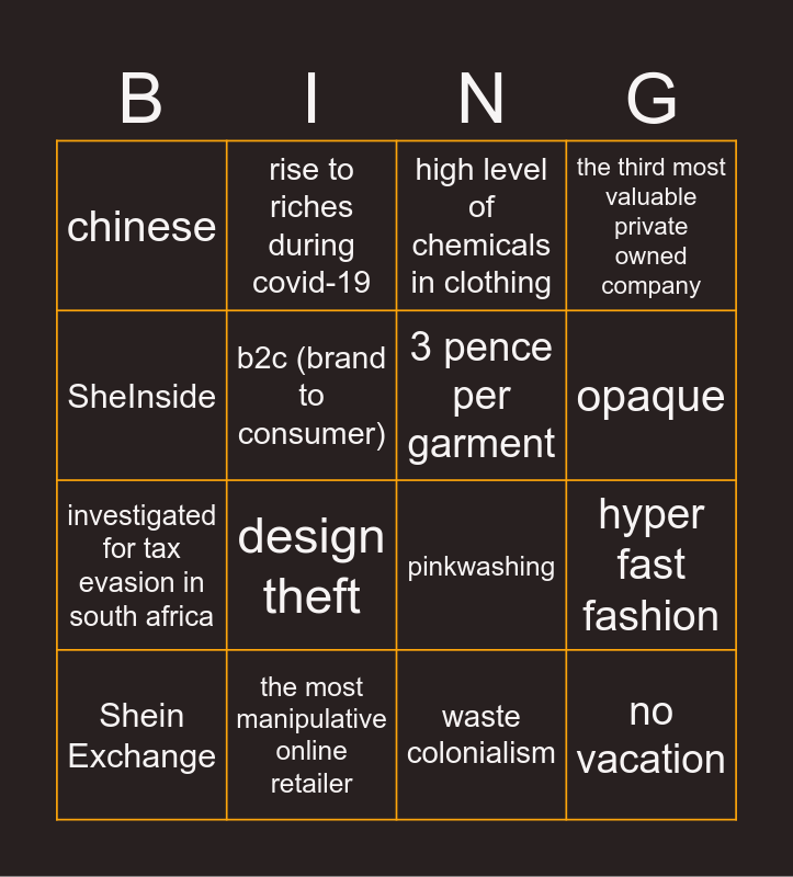 This bingo card has 33 words: Untold: Inside the Shein Machine, Nothing is free!, hyper fast fashion, 18 hours shifts, no vacation, 3 pence per garment, SheInside, TikTok Hauls, rise to riches during covid-19, in love with plastic, opaque, high level of chemicals in clothing, women's rights issue, lack of living wage, the most manipulative online retailer, design theft, sued for design theft, pinkwashing, greenwashing, overproduction, 2k new items added a day, overconsumption, chinese, waste colonialism, plus size, Shein Exchange, the third most valuable private owned company, investigated for tax evasion in south africa, b2c (brand to consumer), micro batch production, investigated for cotton from xingjian region in China, Channel4 and Romwe.