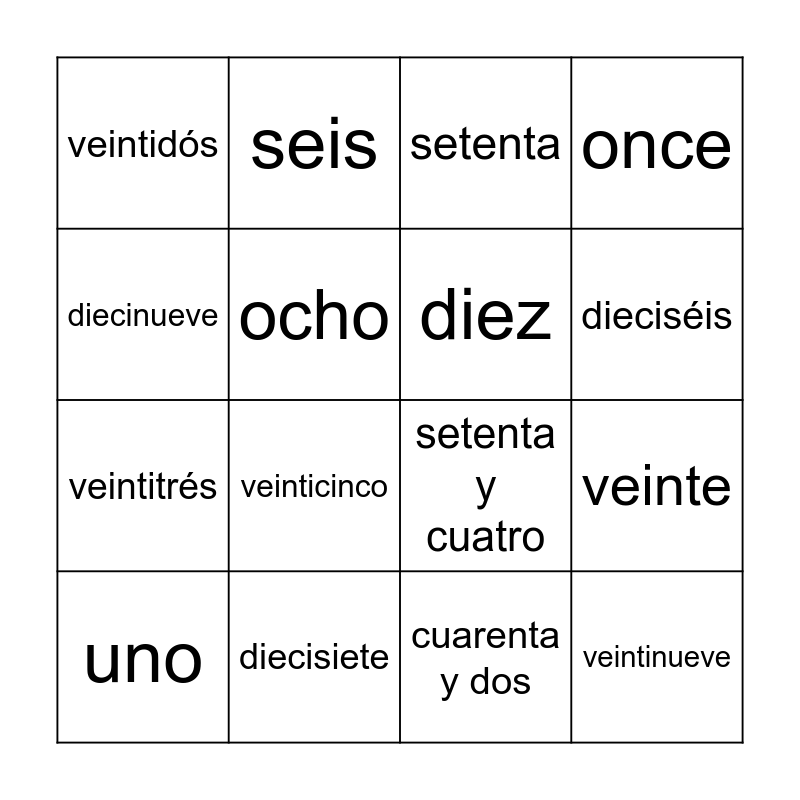 This bingo card has 46 words: Free!, uno, dos, tres, cuatro, cinco, seis, siete, ocho, nueve, diez, once, doce, trece, catorce, quince, dieciséis, diecisiete, dieciocho, diecinueve, veinte, veintiuno, veintidós, veintitrés, veinticuatro, veinticinco, veintiséis, veintisiete, veintiocho, veintinueve, treinta, treinta y uno, treinta y dos, treinta y tres, cuarenta, cuarenta y uno, cuarenta y dos, cincuenta, cincuenta y siete, sesenta, sesenta y nueve, setenta, setenta y cuatro, ochenta y seis, noventa y cinco and cien.