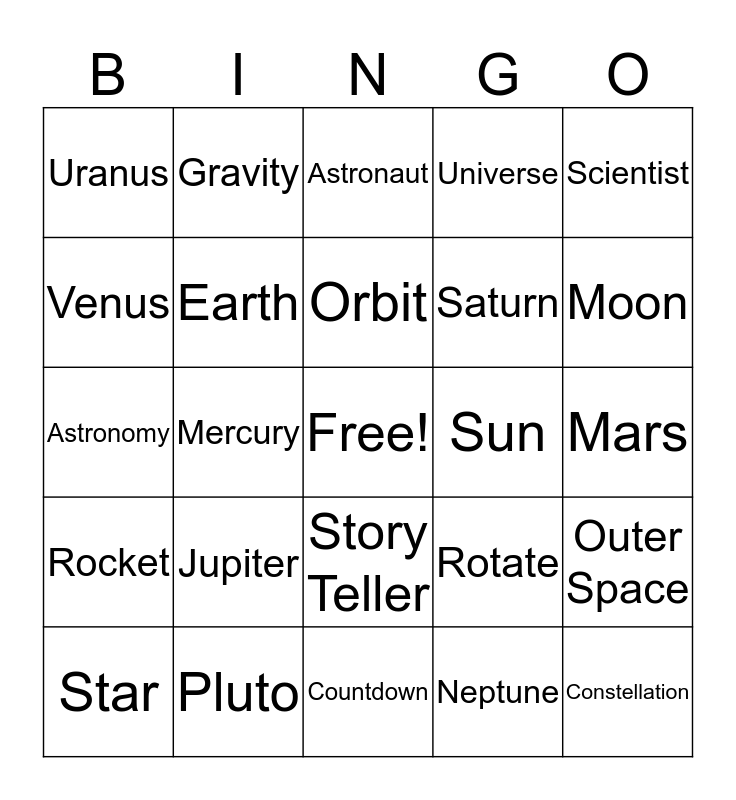 This bingo card has a free space and 24 words: Jupiter, Pluto, Orbit, Star, Scientist, Uranus, Venus, Gravity, Sun, Story Teller, Saturn, Astronomy, Rotate, Outer Space, Earth, Neptune, Mars, Astronaut, Moon, Mercury, Constellation, Rocket, Universe and Countdown.