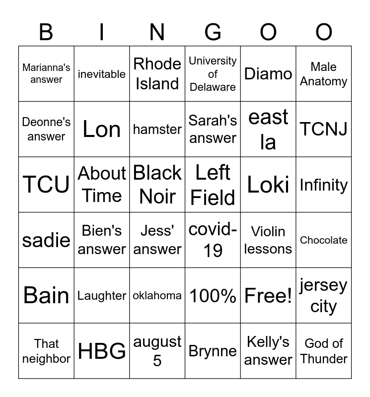 This bingo card has 37 words: Free!, 100%, Kelly's answer, Deonne's answer, Bien's answer, Loki, Lon, Brynne, Diamo, That neighbor, TCNJ, University of Delaware, TCU, Black Noir, Male Anatomy, Left Field, Laughter, Rhode Island, Infinity, About Time, Marianna's answer, Sarah's answer, Jess' answer, Violin lessons, HBG, Chocolate, inevitable, august 5, jersey city, oklahoma, kelly's basketball, covid-19, east la, Bain, sadie, hamster and God of Thunder.
