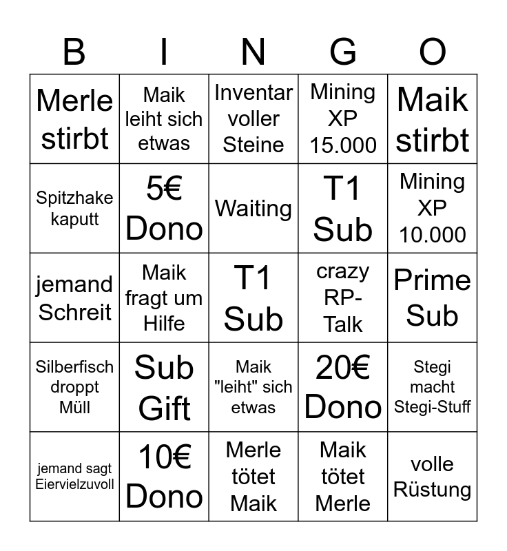This bingo card has a free space and 24 words: Sub Gift, 10€ Dono, Waiting, jemand sagt Eiervielzuvoll, Maik stirbt, Merle stirbt, Spitzhake kaputt, Maik leiht sich etwas, crazy RP-Talk, Maik "leiht" sich etwas, T1 Sub, jemand Schreit, 20€ Dono, Stegi macht Stegi-Stuff, 5€ Dono, Maik tötet Merle, Prime Sub, Inventar voller Steine, Mining XP 10.000, Maik fragt um Hilfe, volle Rüstung, Silberfisch droppt Müll, Mining XP 15.000 and Merle tötet Maik.