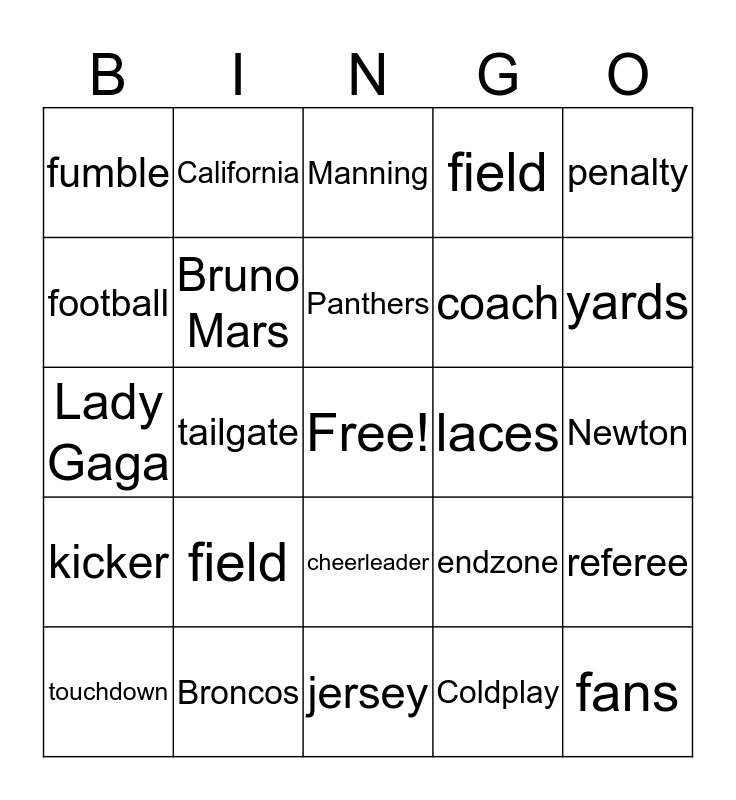 This bingo card has a free space and 24 words: field, Broncos, Panthers, touchdown, penalty, fumble, football, California, laces, cheerleader, coach, Lady Gaga, endzone, referee, Bruno Mars, Coldplay, Newton, Manning, yards, tailgate, fans, kicker, field and jersey.