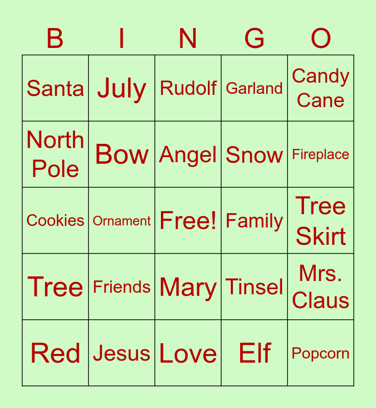 This bingo card has a free space and 40 words: Stocking, Cookies, Wrapping Paper, Bow, Jesus, Mary, Angel, Jingle Bells, Candy Cane, Tree, Ornament, Garland, Popcorn, Tree Skirt, Family, Friends, Presents, Santa, Reindeer, Rudolf, Mrs. Claus, Elf, Snow, North Pole, Nativity, Shopping, Peppermint, Mistletoe, Gingerbread, Caroling, Christmas, Red, Green, Tinsel, Fireplace, Love, Eggnog, Scrooge, July and Wreath.