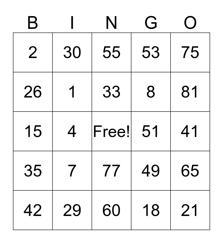 This bingo card has a free space and 24 words: 7, 29, 33, 42, 75, 2, 26, 30, 51, 77, 8, 15, 49, 65, 1, 18, 41, 55, 81, 4, 21, 35, 53 and 60.