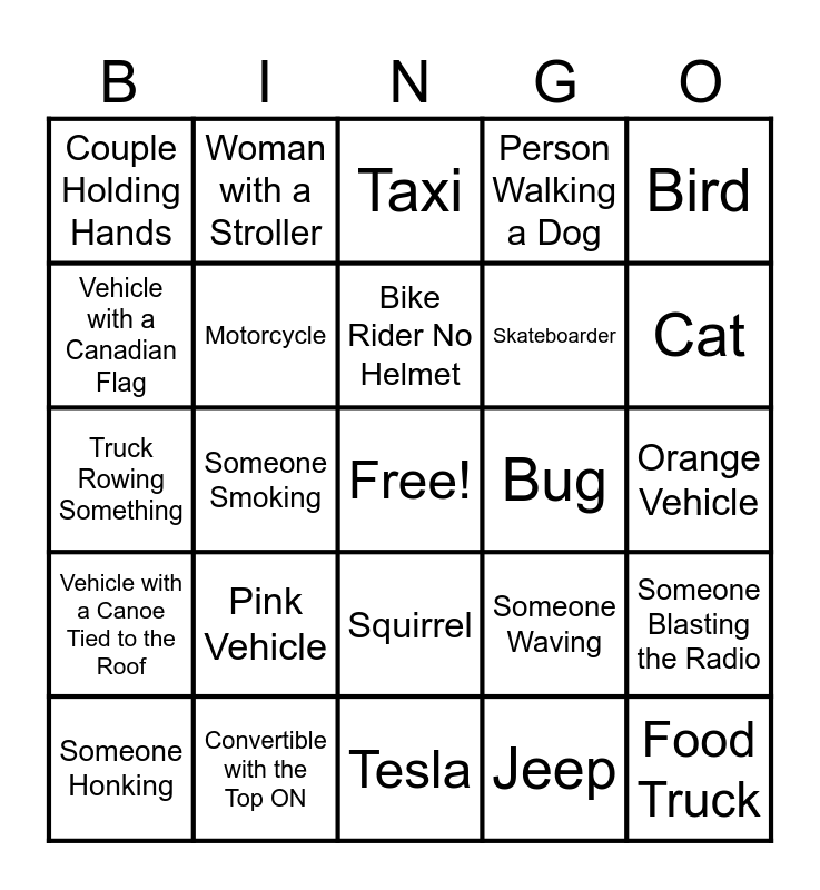 This bingo card has a free space and 24 words: Pink Vehicle, Convertible with the Top ON, Bike Rider No Helmet, Someone Honking, Bird, Couple Holding Hands, Vehicle with a Canadian Flag, Woman with a Stroller, Bug, Squirrel, Skateboarder, Truck Rowing Something, Someone Waving, Someone Blasting the Radio, Motorcycle, Jeep, Orange Vehicle, Taxi, Cat, Someone Smoking, Food Truck, Vehicle with a Canoe Tied to the Roof, Person Walking a Dog and Tesla.
