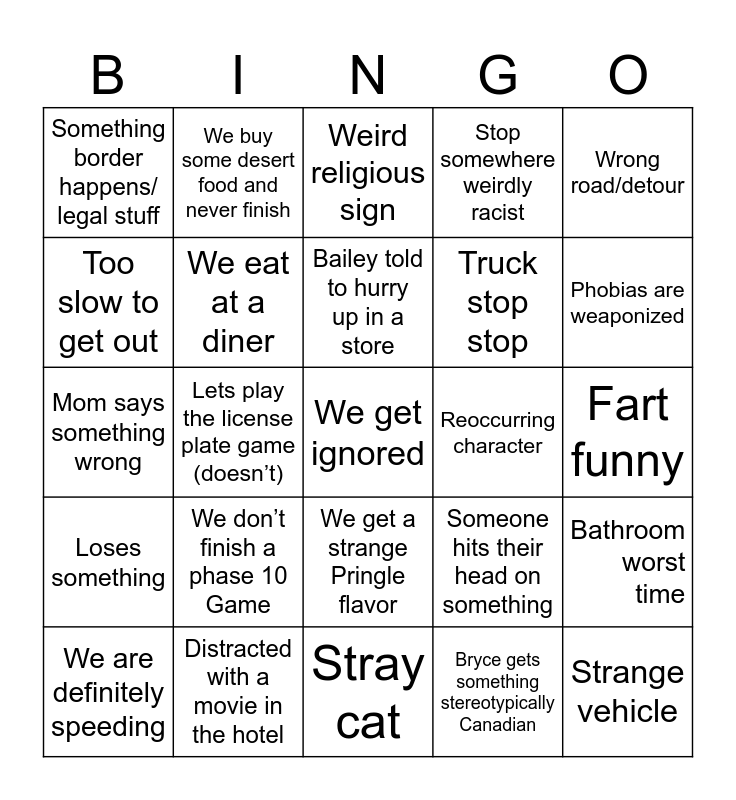 This bingo card has a free space and 24 words: We don’t finish a phase 10 Game, Distracted with a movie in the hotel, Bailey told to hurry up in a store, We are definitely speeding, Wrong road/detour, Something border happens/ legal stuff, Too slow to get out, We buy some desert food and never finish, Reoccurring character, We get a strange Pringle flavor, Truck stop stop, Mom says something wrong, Someone hits their head on something, Bathroom worst time, We eat at a diner, Bryce gets something stereotypically Canadian, Fart funny, Weird religious sign, Phobias are weaponized, Lets play the license plate game (doesn’t), Strange vehicle, Loses something, Stop somewhere weirdly racist and Stray cat.