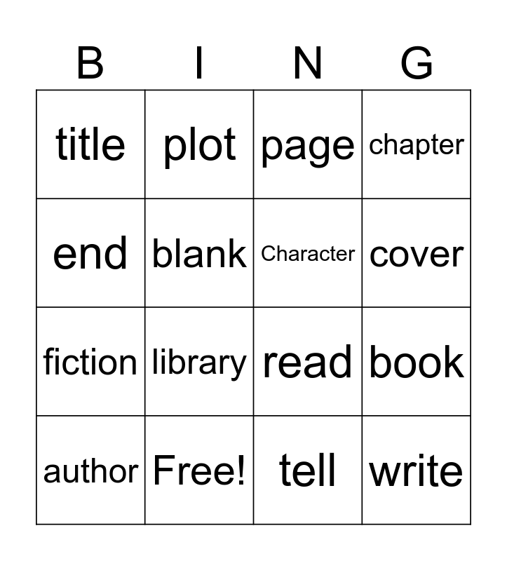 This bingo card has 16 words: Free!, book, page, title, fiction, plot, read, tell, end, blank, author, chapter, library, cover, Character and write.