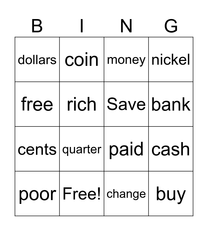 This bingo card has 16 words: Free!, cash, money, dollars, cents, coin, paid, change, free, rich, poor, nickel, quarter, bank, Save and buy.