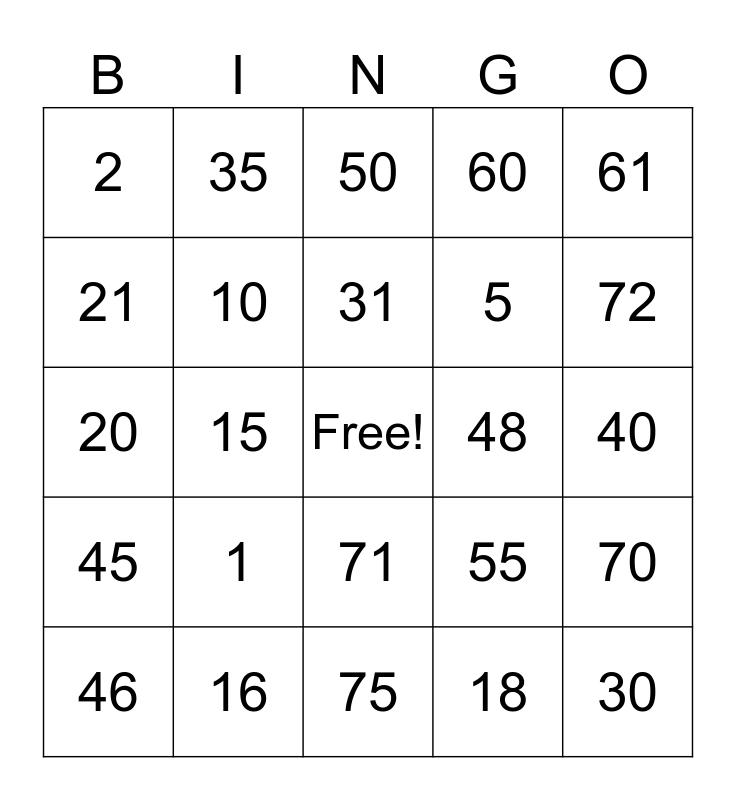 This bingo card has a free space and 24 words: 1, 16, 31, 46, 61, 2, 21, 35, 48, 71, 5, 20, 55, 70, 10, 18, 40, 50, 72, 15, 30, 45, 60 and 75.