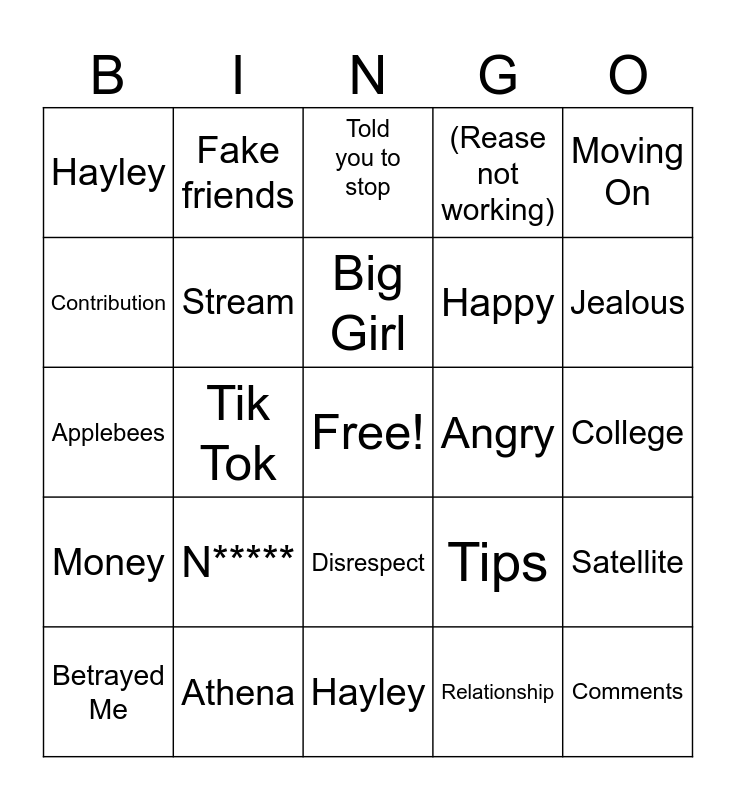 This bingo card has a free space and 25 words: Betrayed Me, N*****, Big Girl, Relationship, Jealous, Hayley, Fake friends, Told you to stop, Happy, Satellite, Applebees, Stream, Tips, Comments, Contribution, Athena, Hayley, (Rease not working), College, Money, Tik Tok, Disrespect, Angry, Moving On and Just Disappointed.