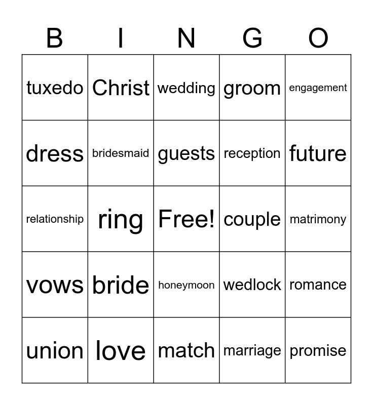 This bingo card has a free space and 24 words: bride, love, guests, union, engagement, tuxedo, dress, Christ, couple, honeymoon, reception, relationship, wedlock, romance, bridesmaid, marriage, matrimony, wedding, future, ring, promise, vows, groom and match.