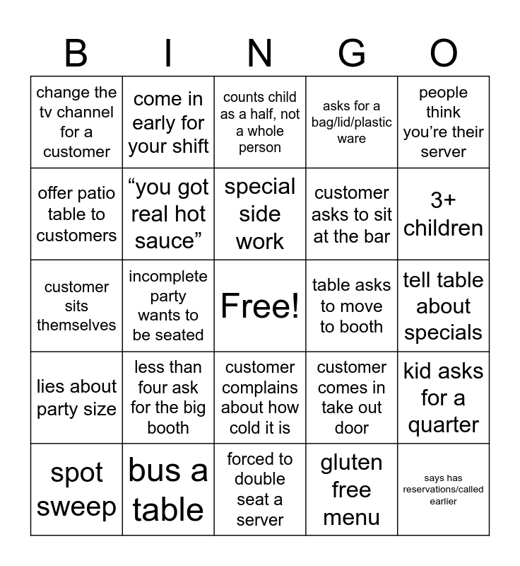This bingo card has a free space and 24 words: less than four ask for the big booth, bus a table, special side work, spot sweep, people think you’re their server, change the tv channel for a customer, offer patio table to customers, come in early for your shift, table asks to move to booth, customer complains about how cold it is, customer asks to sit at the bar, customer sits themselves, customer comes in take out door, kid asks for a quarter, “you got real hot sauce”, gluten free menu, tell table about specials, counts child as a half, not a whole person, 3+ children, incomplete party wants to be seated, says has reservations/called earlier, lies about party size, asks for a bag/lid/plastic ware and forced to double seat a server.