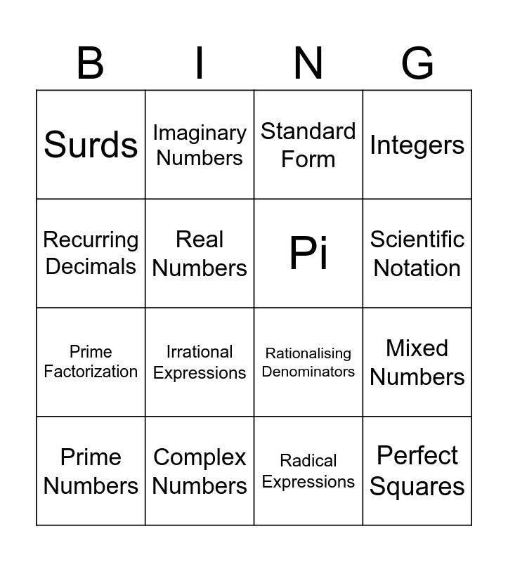 This bingo card has 24 words: Irrational Numbers, Exponents, Scientific Notation, Absolute Value, Recurring Decimals, Surds, Real Numbers, Imaginary Numbers, Complex Numbers, Divisibility Rules, Prime Factorization, Rationalising Denominators, Order of Operations, Non-terminating Decimals, Pi, Euler's Number, Radical Expressions, Standard Form, Irrational Expressions, Mixed Numbers, Prime Numbers, Perfect Squares, Integers and Rational Numbers.