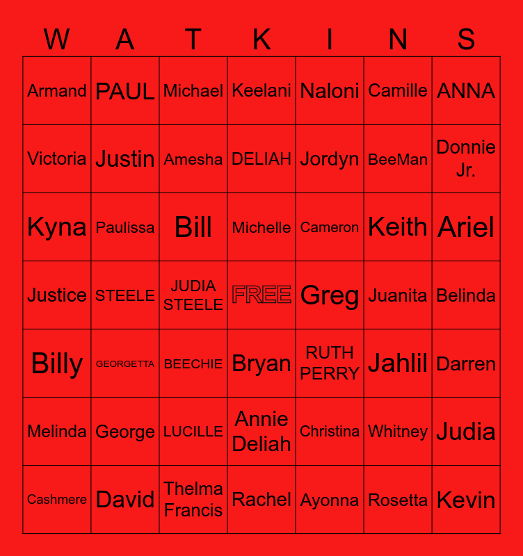 This bingo card has a free space and 120 words: THELMA, MOSBY LINCOLN, JUDIA STEELE, DONNIE, RUTH, WILLIAM, ANNA, CLYDE, STEELE, BEECHIE, ALVIN, VESS, Abigail, Addie Mae, Adrian, Alvester, Amesha, Angela, Anthony, Anthony Jr., Ariel, Armand, Asiha, Avery, Ayonna, BeeMan, Belinda, Billy, Braylen, Brielle, Bryan, Cameron, Camille, Carlton, Cashmere, Catherine, Charles, Chris, Christina, Cory, Darren, Daryl, David, Deborah, Annie Deliah, Dianne, Jahlil, Donnie Jr., Frank, George, Gianni, Jeannine, Greg, Jelisa, Jaiden, James, James Paul, Jayla, John, Jordyn, Juanita, Jemesha, Jennifer, Jermaine, Jessica, Keelani, Keenan, Keith, Judia, Justice, Justin, Keacha, Louise, Marie, Marvin, Kevin, Kyna, Kyree, Michael, Michelle, Naloni, Nicholas, Nicole, Melinda, Micha, Phillip, Rachel, Ricardo, Rosetta, Sierra, Steven, Paulissa, Thelma Francis, Tia, Timothy, Tim, Vertis, Victoria, Tarsha, Bill, Xavier, Zara, Whitney, FANNIE, JOHNSIE, PAUL, ADDIE LEE, WILLIAM GARVIN SR., RUTH PERRY, ELIZABETH, Devynn, Trinity, GEORGETTA, LUCILLE, DELIAH, Richard, Laryn, Laila, Gabriella and Donnie Harris.