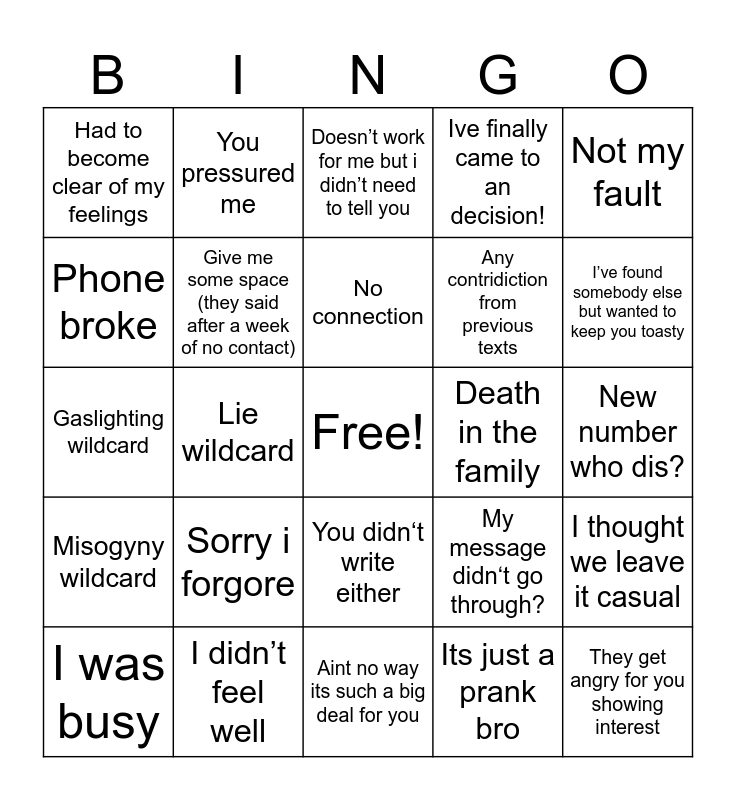 This bingo card has a free space and 24 words: Sorry i forgore, I didn’t feel well, No connection, I was busy, Not my fault, Had to become clear of my feelings, Phone broke, You pressured me, Death in the family, You didn‘t write either, Any contridiction from previous texts, Gaslighting wildcard, My message didn‘t go through?, I thought we leave it casual, Give me some space (they said after a week of no contact), Its just a prank bro, New number who dis?, Doesn’t work for me but i didn’t need to tell you, I’ve found somebody else but wanted to keep you toasty, Lie wildcard, They get angry for you showing interest, Misogyny wildcard, Ive finally came to an decision! and Aint no way its such a big deal for you.