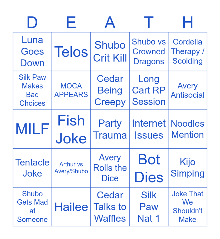 This bingo card has a free space and 24 words: Arthur vs Avery/Shubo, Hailee, Cedar Being Creepy, Shubo Gets Mad at Someone, Cordelia Therapy / Scolding, Luna Goes Down, Silk Paw Makes Bad Choices, Telos, Internet Issues, Avery Rolls the Dice, Long Cart RP Session, MILF, Bot Dies, Kijo Simping, MOCA APPEARS, Silk Paw Nat 1, Noodles Mention, Shubo Crit Kill, Avery Antisocial, Fish Joke, Joke That We Shouldn't Make, Tentacle Joke, Shubo vs Crowned Dragons and Cedar Talks to Waffles.