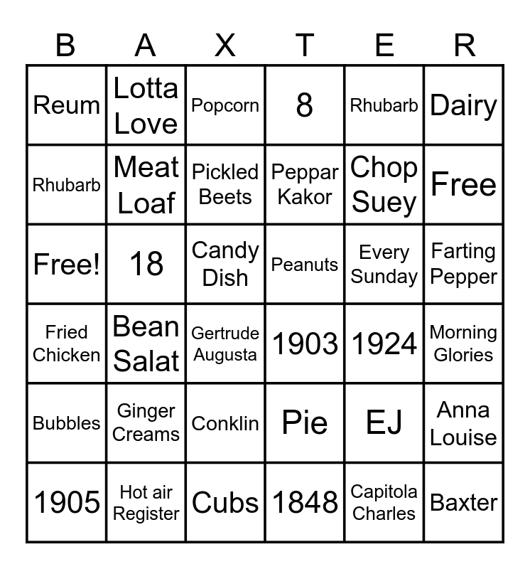 This bingo card has 36 words: Pie, Conklin, 1848, Rhubarb, Fried Chicken, Peanuts, Meat Loaf, Cubs, Rhubarb, EJ, Free, 8, Anna Louise, 18, Peppar Kakor, Reum, Bubbles, Every Sunday, Free!, Popcorn, Candy Dish, Bean Salat, 1903, Gertrude Augusta, 1924, Lotta Love, Chop Suey, Hot air Register, Pickled Beets, Dairy, Baxter, 1905, Morning Glories, Farting Pepper, Ginger Creams and Capitola Charles.
