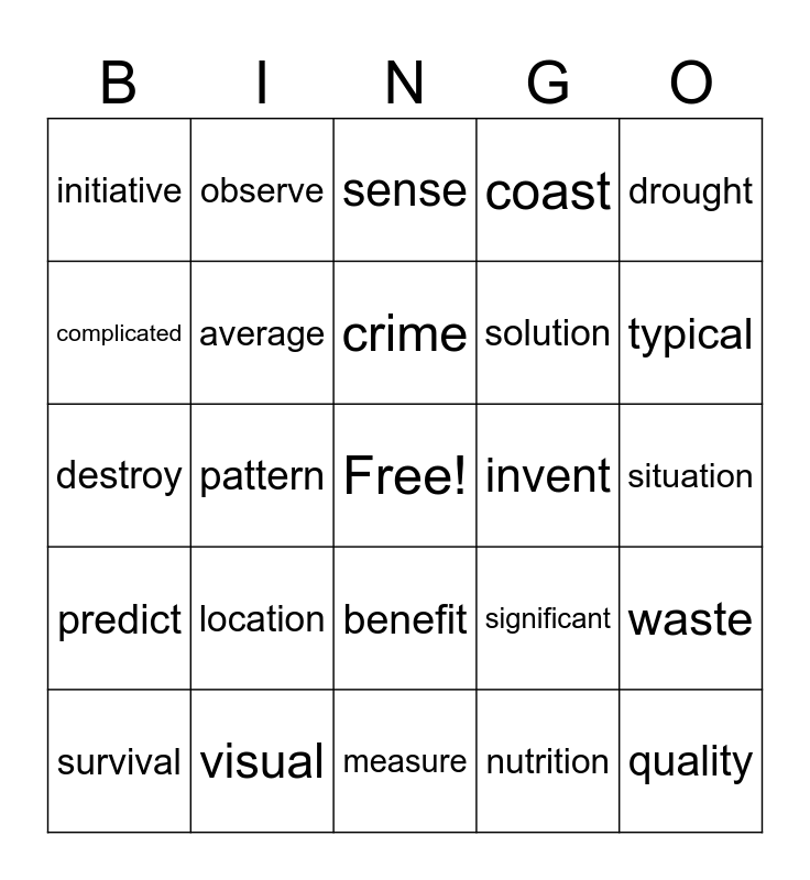 This bingo card has a free space and 35 words: achieve, adventure, advertise, average, benefit, coast, complicated, conflict, crime, damage, destroy, drought, forecast, impact, initiative, invent, nutrition, pattern, predict, quality, significant, survival, waste, visual, sense, typical, traditional, support, solution, situation, require, measure, location, observe and memory.