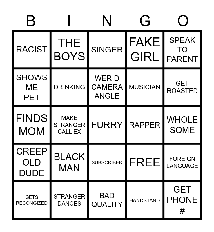 This bingo card has 25 words: BLACK MAN, BAD QUALITY, WERID CAMERA ANGLE, GETS RECONGIZED, SPEAK TO PARENT, RACIST, SHOWS ME PET, THE BOYS, RAPPER, SUBSCRIBER, MUSICIAN, FINDS MOM, FREE, FOREIGN LANGUAGE, DRINKING, GET PHONE #, WHOLE SOME, SINGER, GET ROASTED, MAKE STRANGER CALL EX, FURRY, STRANGER DANCES, CREEP OLD DUDE, FAKE GIRL and HANDSTAND.