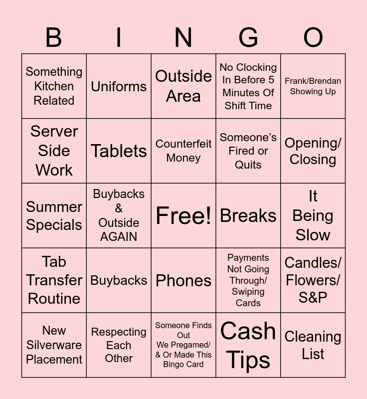 This bingo card has a free space and 24 words: Buybacks, Respecting Each Other, Counterfeit Money, New Silverware Placement, Frank/Brendan Showing Up, Something Kitchen Related, Server Side Work, Uniforms, Breaks, Phones, Someone’s Fired or Quits, Summer Specials, Payments Not Going Through/ Swiping Cards, Candles/ Flowers/ S&P, Tablets, Cash Tips, It Being Slow, Outside Area, Opening/ Closing, Buybacks & Outside AGAIN, Cleaning List, Tab Transfer Routine, No Clocking In Before 5 Minutes Of Shift Time and Someone Finds Out We Pregamed/ & Or Made This Bingo Card.