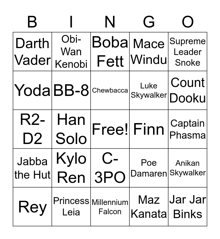 This bingo card has a free space and 24 words: Kylo Ren, Princess Leia, Chewbacca, Rey, Supreme Leader Snoke, Darth Vader, Yoda, Obi-Wan Kenobi, Finn, C-3PO, Luke Skywalker, R2-D2, Poe Damaren, Anikan Skywalker, BB-8, Maz Kanata, Captain Phasma, Boba Fett, Count Dooku, Han Solo, Jar Jar Binks, Jabba the Hut, Mace Windu and Millennium Falcon.