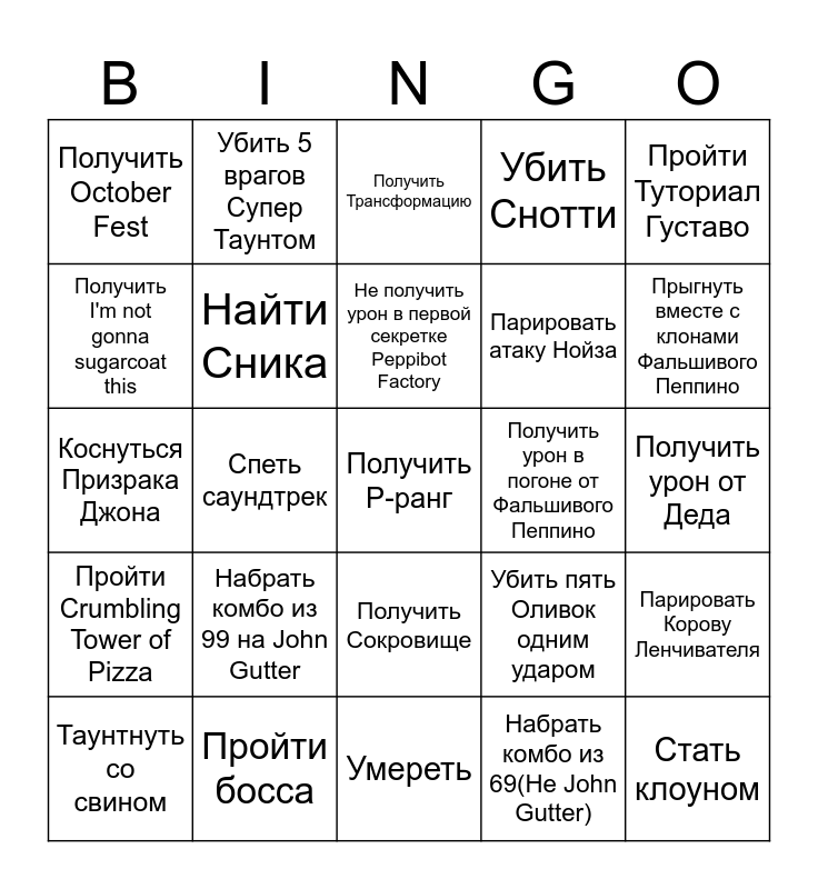 This bingo card has a free space and 24 words: Набрать комбо из 99 на John Gutter, Пройти босса, Не получить урон в первой секретке Peppibot Factory, Таунтнуть со свином, Пройти Туториал Густаво, Получить October Fest, Получить I'm not gonna sugarcoat this, Убить 5 врагов Супер Таунтом, Получить урон в погоне от Фальшивого Пеппино, Получить Сокровище, Парировать атаку Нойза, Коснуться Призрака Джона, Убить пять Оливок одним ударом, Парировать Корову Ленчивателя, Найти Сника, Набрать комбо из 69(Не John Gutter), Получить урон от Деда, Получить Трансформацию, Прыгнуть вместе с клонами Фальшивого Пеппино, Спеть саундтрек, Стать клоуном, Пройти Crumbling Tower of Pizza, Убить Снотти and Умереть.
