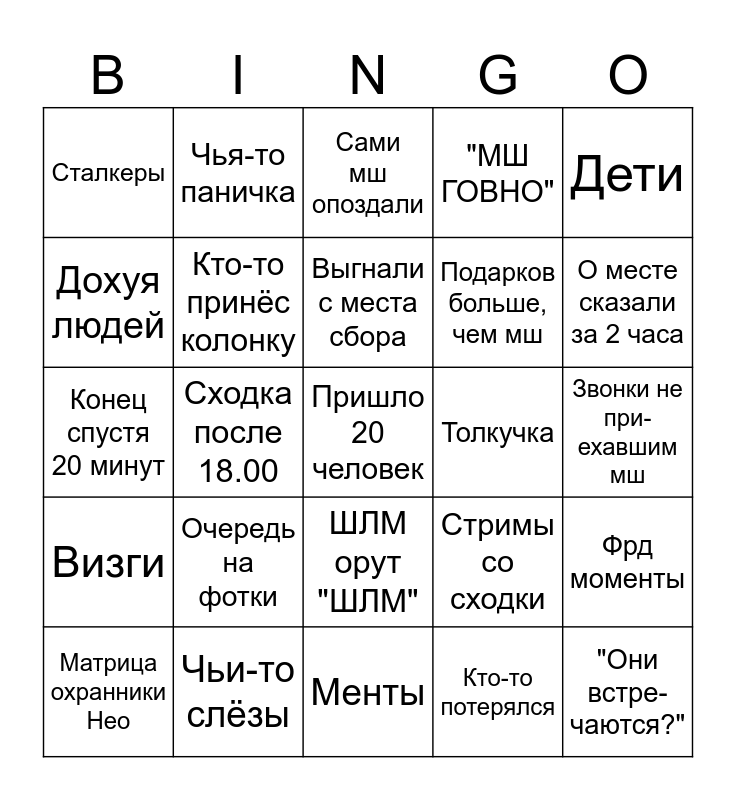 This bingo card has 25 words: Очередь на фотки, Менты, Выгнали с места сбора, Матрица охранники Нео, Дети, Сталкеры, Дохуя людей, Чья-то паничка, Толкучка, ШЛМ орут "ШЛМ", Подарков больше, чем мш, Конец спустя 20 минут, Стримы со сходки, Фрд моменты, Кто-то принёс колонку, "Они встре- чаются?", Звонки не при- ехавшим мш, Сами мш опоздали, О месте сказали за 2 часа, Сходка после 18.00, Пришло 20 человек, Чьи-то слёзы, Визги, "МШ ГОВНО" and Кто-то потерялся.