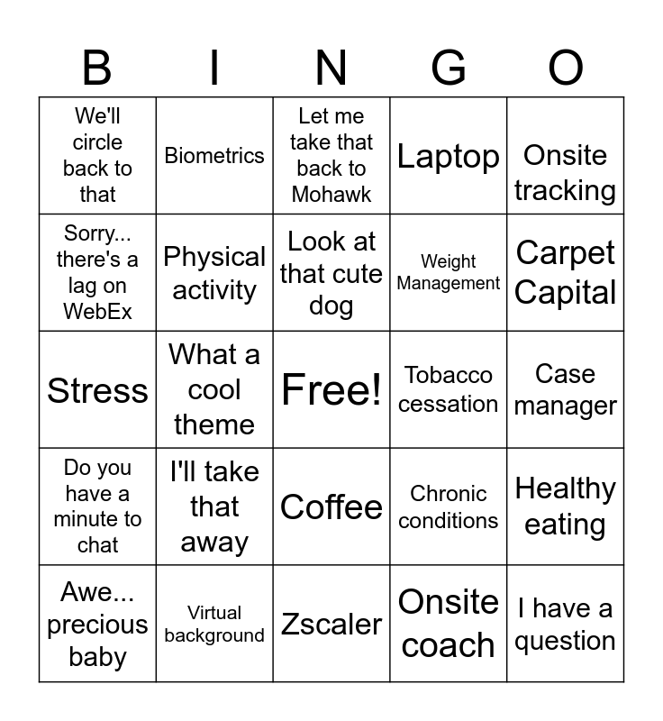 This bingo card has a free space and 24 words: I'll take that away, Virtual background, Look at that cute dog, Awe... precious baby, Onsite tracking, We'll circle back to that, Sorry... there's a lag on WebEx, Biometrics, Tobacco cessation, Coffee, Weight Management, Stress, Chronic conditions, Healthy eating, Physical activity, Onsite coach, Case manager, Let me take that back to Mohawk, Carpet Capital, What a cool theme, I have a question, Do you have a minute to chat, Laptop and Zscaler.