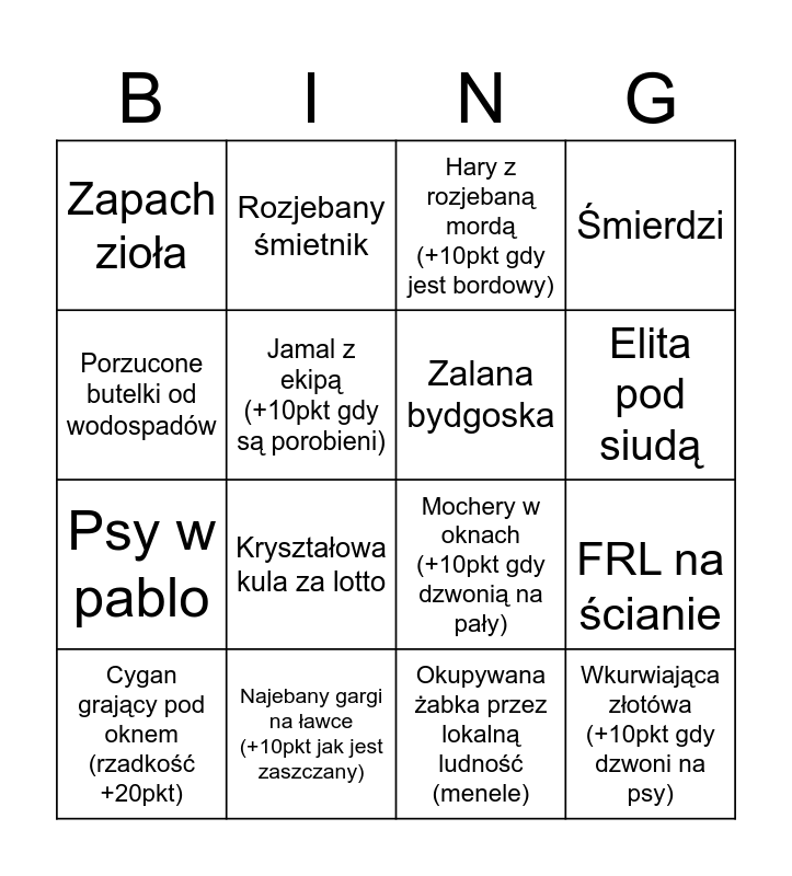 This bingo card has 16 words: Najebany gargi na ławce (+10pkt jak jest zaszczany), FRL na ścianie, Hary z rozjebaną mordą (+10pkt gdy jest bordowy), Zapach zioła, Psy w pablo, Rozjebany śmietnik, Mochery w oknach (+10pkt gdy dzwonią na pały), Okupywana żabka przez lokalną ludność (menele), Porzucone butelki od wodospadów, Jamal z ekipą (+10pkt gdy są porobieni), Cygan grający pod oknem (rzadkość +20pkt), Śmierdzi, Kryształowa kula za lotto, Elita pod siudą, Zalana bydgoska and Wkurwiająca złotówa (+10pkt gdy dzwoni na psy).