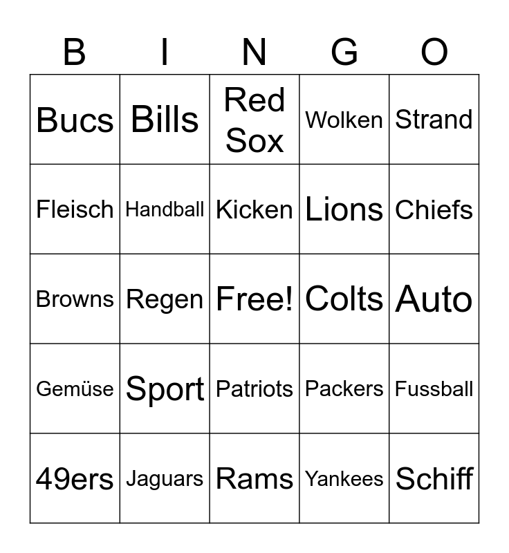 This bingo card has a free space and 37 words: 50 Länder bereist, Trinke kein Alkohol, Pole Dance, Handball, Fussball, Sport, Kicken, Schule, Strand, Sonne, Regen, Wolken, Schiff, Auto, Fleisch, Gemüse, Obst, Red Sox, Patriots, Colts, Bucs, Chiefs, 49ers, Rams, Titans, Yankees, Bills, Broncos, Miami, Jerry, Giants, Jaguars, Browns, Seahawks, Packers, Lions and Cowboys.