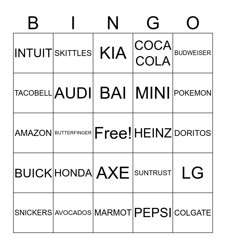 This bingo card has a free space and 41 words: ACURA, AMAZON, APARTMENTS, AUDI, AVOCADOS, AXE, BAI, BUD LIGHT, BUDWEISER, BUICK, BUTTERFINGER, COCA COLA, COLGATE, DORITOS, HEINZ, HONDA, HYUNDAI, INTUIT, JACK IN THE BOX, KIA, LG, MACHINE, MARMOT, MINI, MOUNTAINDEW, PAYPAL, PEPSI, PERSIL, POKEMON, QUICKEN, SHOCKTOP, SKITTLES, SNICKERS, SOFI, SUNTRUST, TACOBELL, T MOBILE, TOYOTA, TURBOTAX, WEATHERTECH and WIX.