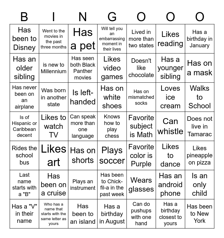 This bingo card has 49 words: Last name starts with a "B", Was born in another state, Plays an instrument, Plays soccer, Has on mismatched socks, Can whistle, Has a birthday in January, Has a "V" in their name, is new to Millennium, Can speak more than one language, Likes video games, Lived in more than two states, Has a younger sibling, Walks to School, Rides the school bus, Likes art, Has a pet, Has on white shoes, Can do pushups with one hand, Likes reading, Has on a mask, Has an older sibling, Went to the movies in the past three months, Has seen both Black Panther movies, Has a birthday in August, Doesn't like chocolate, Loves ice cream, Is an only child, Has been to Disney, Likes to watch TV, Has been to an island, Has been to Chick-fil-a in the past week, Favorite color is Purple, Has an android phone, Does not live in Tamarac, Is of Hispanic or Caribbean decent, Has been on a cruise, Has on shorts, Knows how to play chess, Favorite subject is Math, Has a birthday closest to yours, Likes pineapple on pizza, Has never been on an airplane, Who has a name that starts with the same letter as yours, Is left-handed, Will tell you an embarrassing moment in their lives, Wears glasses, Likes to dance and Has been to New York.