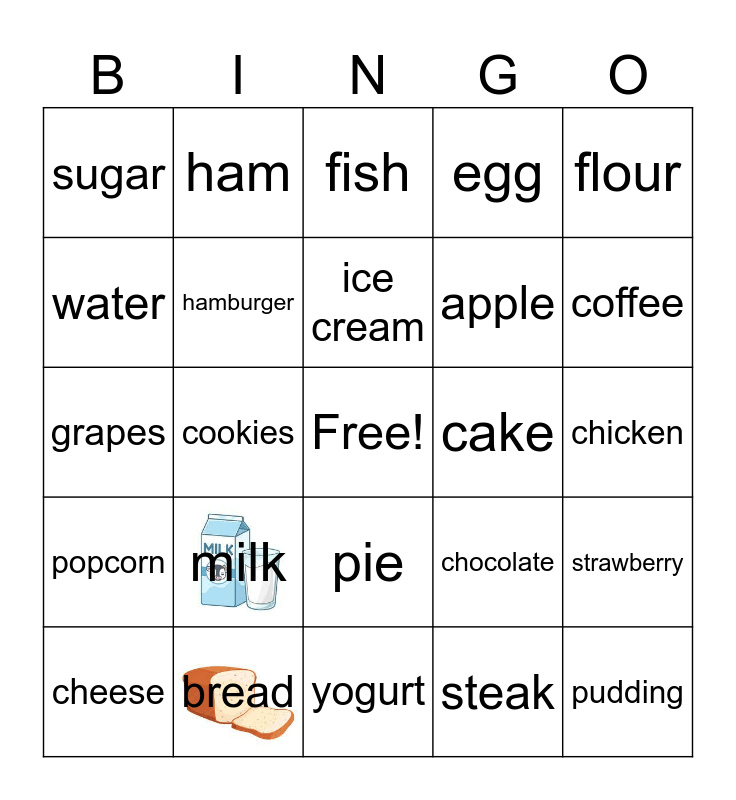 This bingo card has 2 images, a free space and 24 words: milk, bread, ice cream, cheese, flour, sugar, water, ham, cake, pie, apple, grapes, chocolate, strawberry, hamburger, steak, chicken, fish, coffee, cookies, pudding, popcorn, egg and yogurt.