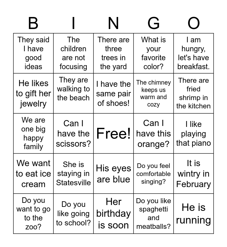 This bingo card has a free space and 24 words: She is staying in Statesville, Do you like going to school?, I have the same pair of shoes!, Do you want to go to the zoo?, I am hungry, let's have breakfast., They said I have good ideas, He likes to gift her jewelry, The children are not focusing, Can I have this orange?, His eyes are blue, The chimney keeps us warm and cozy, We are one big happy family, Do you feel comfortable singing?, It is wintry in February, They are walking to the beach, Do you like spaghetti and meatballs?, I like playing that piano, There are three trees in the yard, There are fried shrimp in the kitchen, Can I have the scissors?, He is running, We want to eat ice cream, What is your favorite color? and Her birthday is soon.
