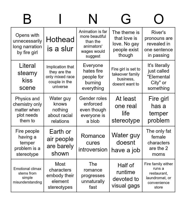This bingo card has a free space and 24 words: Earth or air people are barely shown, Most characters embody their element stereotypes, Everyone hates fire people for burning everything, Emotional climax stems from simple misunderstanding, River's pronouns are revealed in one sentence in passing, Opens with unnecessarily long narration by fire girl, Literal steamy kiss scene, Hothead is a slur, At least one real life stereotype, Romance cures introversion, Fire girl is set to takeover family business, doesnt want to, Physics and chemistry only matter when plot needs them to, Water guy doesnt have a job, The only fat female characters are the 2 moms, Implication that they are the only mixed race couple in the universe, Half of runtime devoted to visual gags, Fire girl has a temper problem, Animation is far more beautiful than the animators' wages would suggest, It's literally just called "Elemental City" or something, Water guy knows nothing about racial relations, Fire family either runs a restaurant, laundromat, or convenience store, Fire people having a temper problem is a stereotype, The theme is that love is love. No gay people exist though and The romance progresses unnaturally fast.