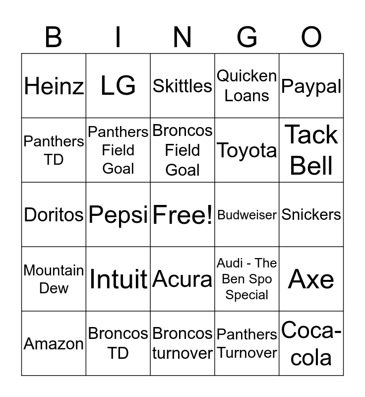 This bingo card has a free space and 24 words: Intuit, Broncos TD, Broncos Field Goal, Amazon, Paypal, Heinz, Panthers TD, LG, Budweiser, Acura, Toyota, Doritos, Audi - The Ben Spo Special, Axe, Panthers Field Goal, Panthers Turnover, Snickers, Skittles, Tack Bell, Pepsi, Coca-cola, Mountain Dew, Quicken Loans and Broncos turnover.